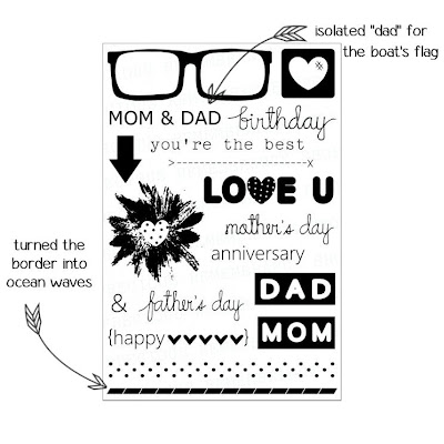 I stamped the border onto a sheet of blue cardstock, cut it apart into strips, and then adhered them under the boat.